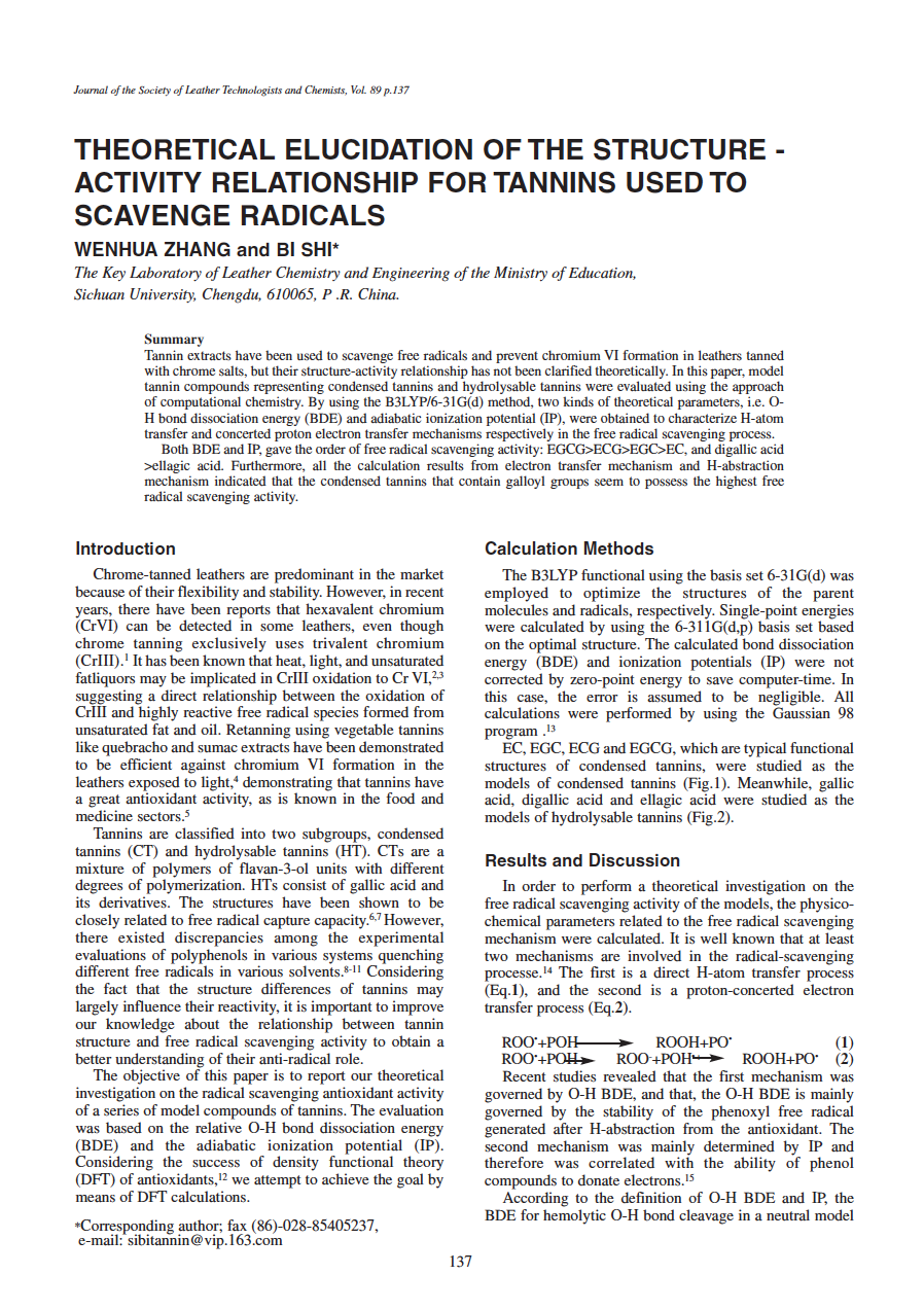 Tannin extracts have been used to scavenge free radicals and prevent chromium VI formation in leathers tanned with chrome salts, but their structure-activity relationship has not been clarified theoretically. In this paper, model tannin compounds representing condensed tannins and hydrolysable tannins were evaluated using the approach of computational chemistry. By using the B3LYP/6-31G(d) method, two kinds of theoretical parameters, i.e. OH bond dissociation energy (BDE) and adiabatic ionization potential (IP), were obtained to characterize H-atom transfer and concerted proton electron transfer mechanisms respectively in the free radical scavenging process.
