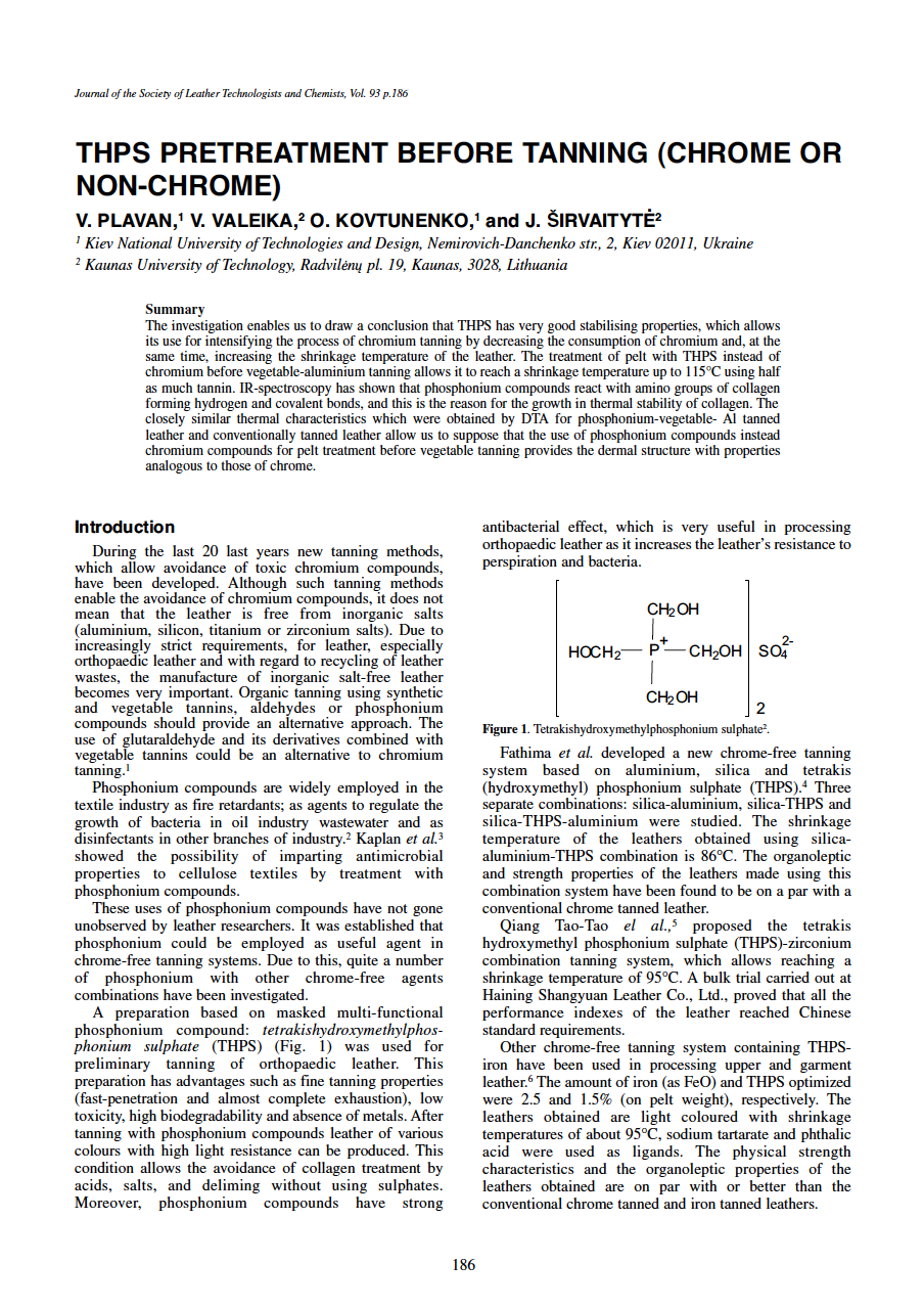 The investigation enables us to draw a conclusion that THPS has very good stabilising properties, which allows its use for intensifying the process of chromium tanning by decreasing the consumption of chromium and, at the same time, increasing the shrinkage temperature of the leather. The treatment of pelt with THPS instead of chromium before vegetable-aluminium tanning allows it to reach a shrinkage temperature up to 115°C using half as much tannin. IR-spectroscopy has shown that phosphonium compounds react with amino groups of collagen forming hydrogen and covalent bonds, and this is the reason for the growth in thermal stability of collagen. The closely similar thermal characteristics which were obtained by DTA for phosphonium-vegetable- Al tanned leather and conventionally tanned leather allow us to suppose that the use of phosphonium compounds instead chromium compounds for pelt treatment before vegetable tanning provides the dermal structure with properties analogous to those of chrome.