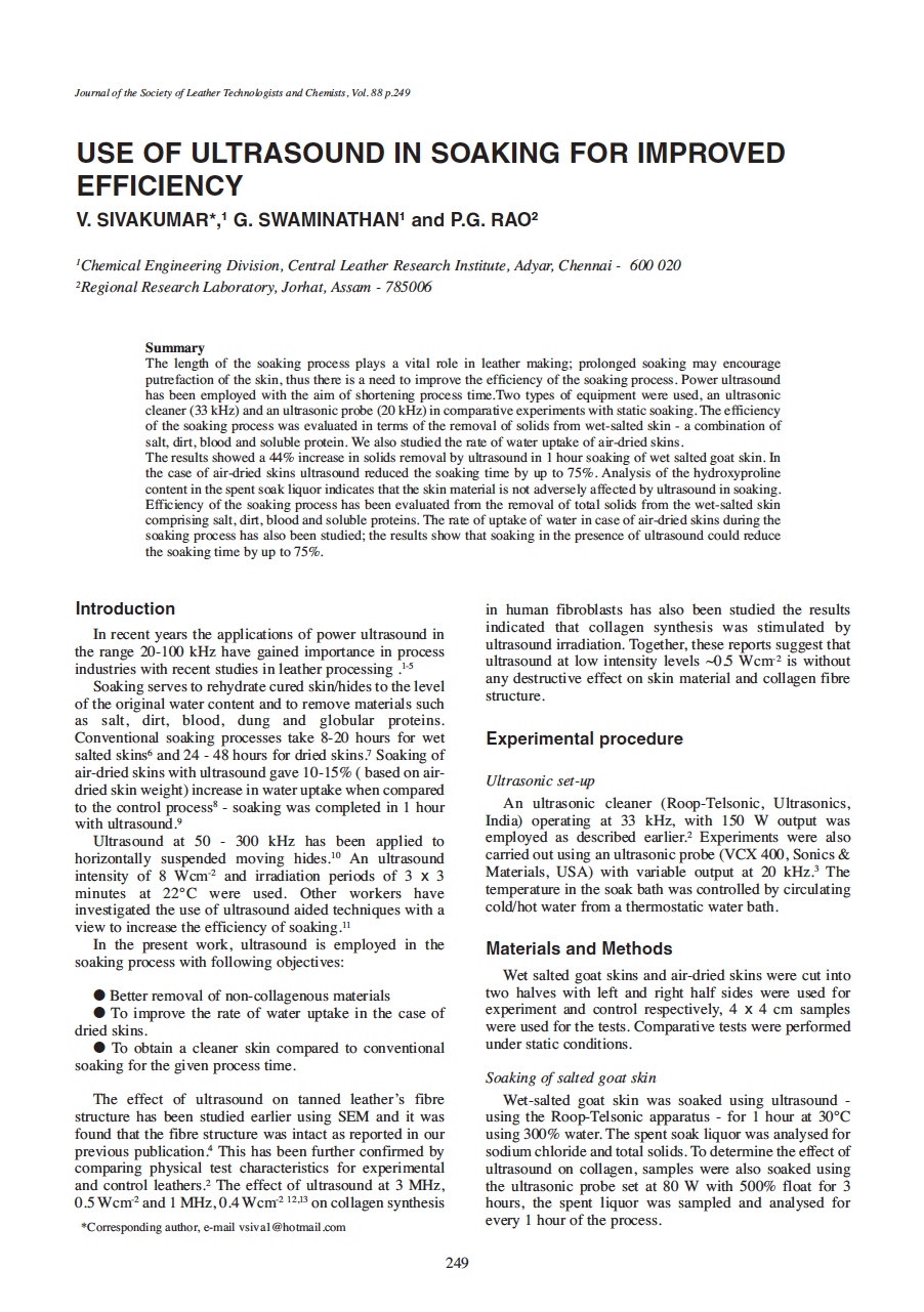 The length of the soaking process plays a vital role in leather making; prolonged soaking may encourage putrefaction of the skin, thus there is a need to improve the efficiency of the soaking process. Power ultrasound has been employed with the aim of shortening process time.Two types of equipment were used, an ultrasonic cleaner (33 kHz) and an ultrasonic probe (20 kHz) in comparative experiments with static soaking. The efficiency of the soaking process was evaluated in terms of the removal of solids from wet-salted skin – a combination of salt, dirt, blood and soluble protein. We also studied the rate of water uptake of air-dried skins. The results showed a 44% increase in solids removal by ultrasound in 1 hour soaking of wet salted goat skin. In the case of air-dried skins ultrasound reduced the soaking time by up to 75%. Analysis of the hydroxyproline content in the spent soak liquor indicates that the skin material is not adversely affected by ultrasound in soaking. Efficiency of the soaking process has been evaluated from the removal of total solids from the wet-salted skin comprising salt, dirt, blood and soluble proteins. The rate of uptake of water in case of air-dried skins during the soaking process has also been studied; the results show that soaking in the presence of ultrasound could reduce the soaking time by up to 75%.