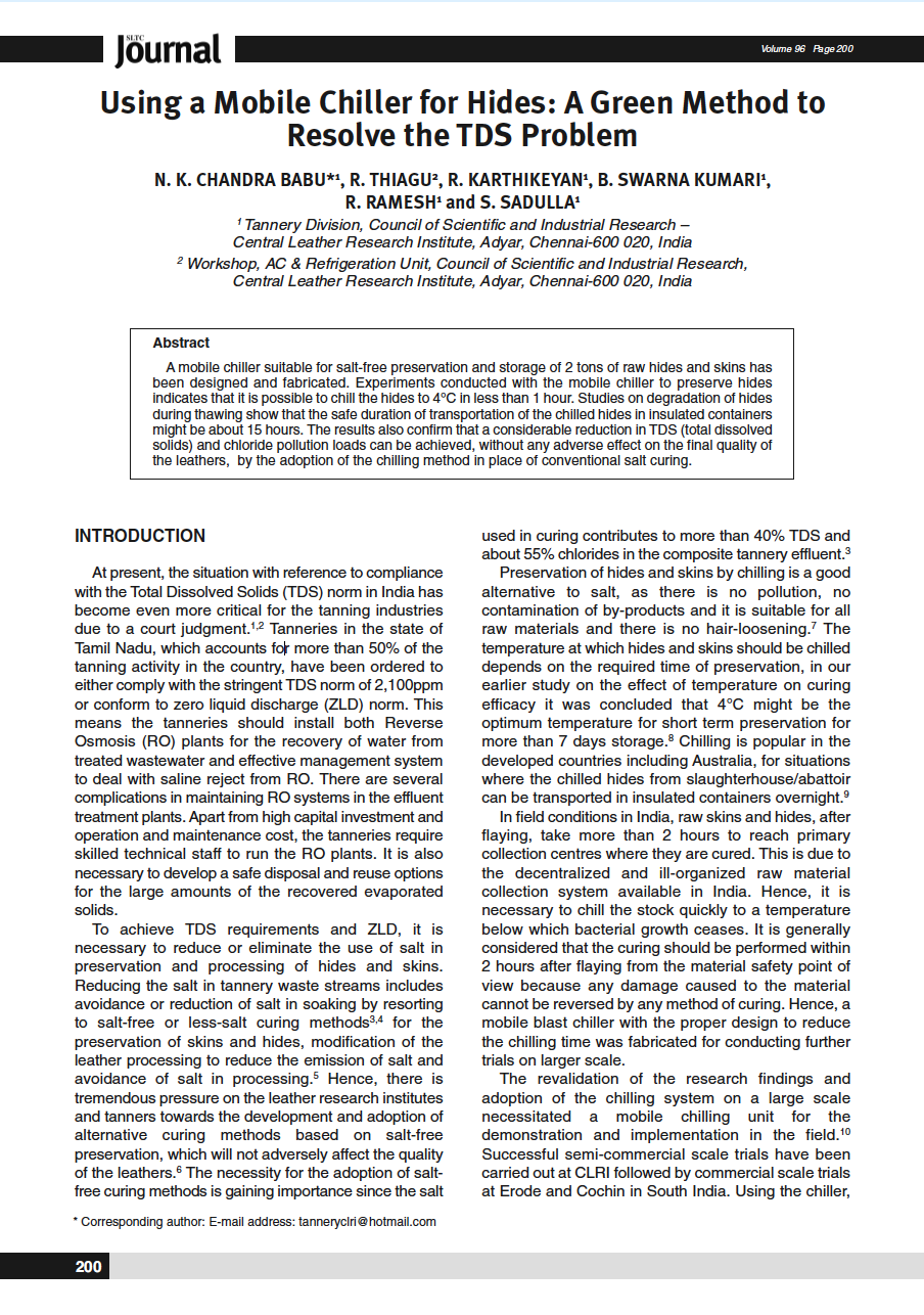 A mobile chiller suitable for salt-free preservation and storage of 2 tons of raw hides and skins has been designed and fabricated. Experiments conducted with the mobile chiller to preserve hides indicates that it is possible to chill the hides to 4°C in less than 1 hour. Studies on degradation of hides during thawing show that the safe duration of transportation of the chilled hides in insulated containers might be about 15 hours. The results also confirm that a considerable reduction in TDS (total dissolved solids) and chloride pollution loads can be achieved, without any adverse effect on the final quality of the leathers, by the adoption of the chilling method in place of conventional salt curing.