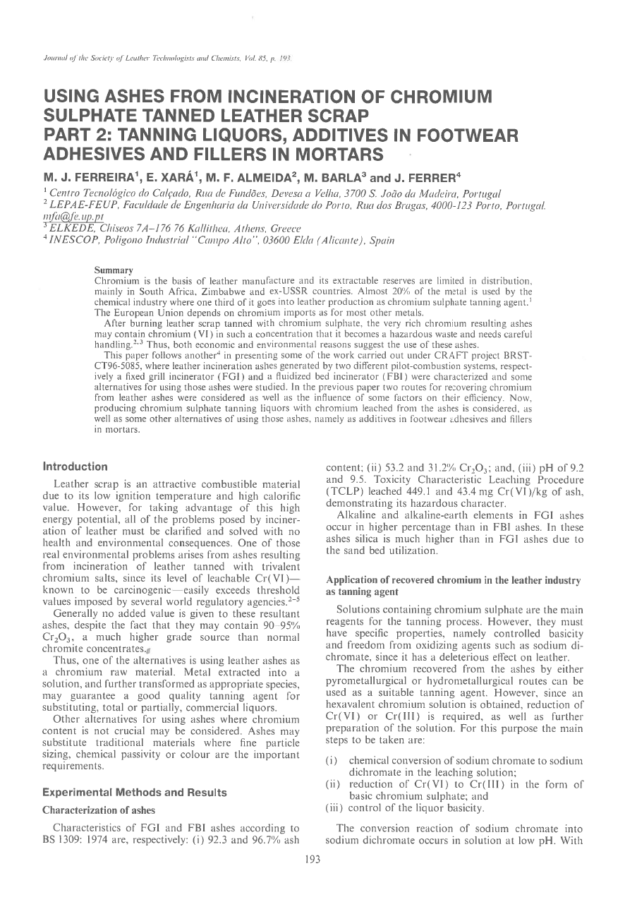 This paper follows another 4in presenting some of the work carried out under CRAFT project BRST CT96-5085. where leather incineration ashes generated by two different pilot—combustion systems, respect ively a fixed grill incinerator (FGI) and a fluidized bed incinerator (FBI) were characterized and some alternatives for using those ashes were studied. In the previous paper two routes for recovering chromium from leather ashes were considered as well as the influence of some factors on their efficiency. Now, producing chromium sulphate tanning liquors with chromium leached from the ashes is considered, as well as some other alternatives of using those ashes, namely as additives in footwear adhesives and fillers in mortars.