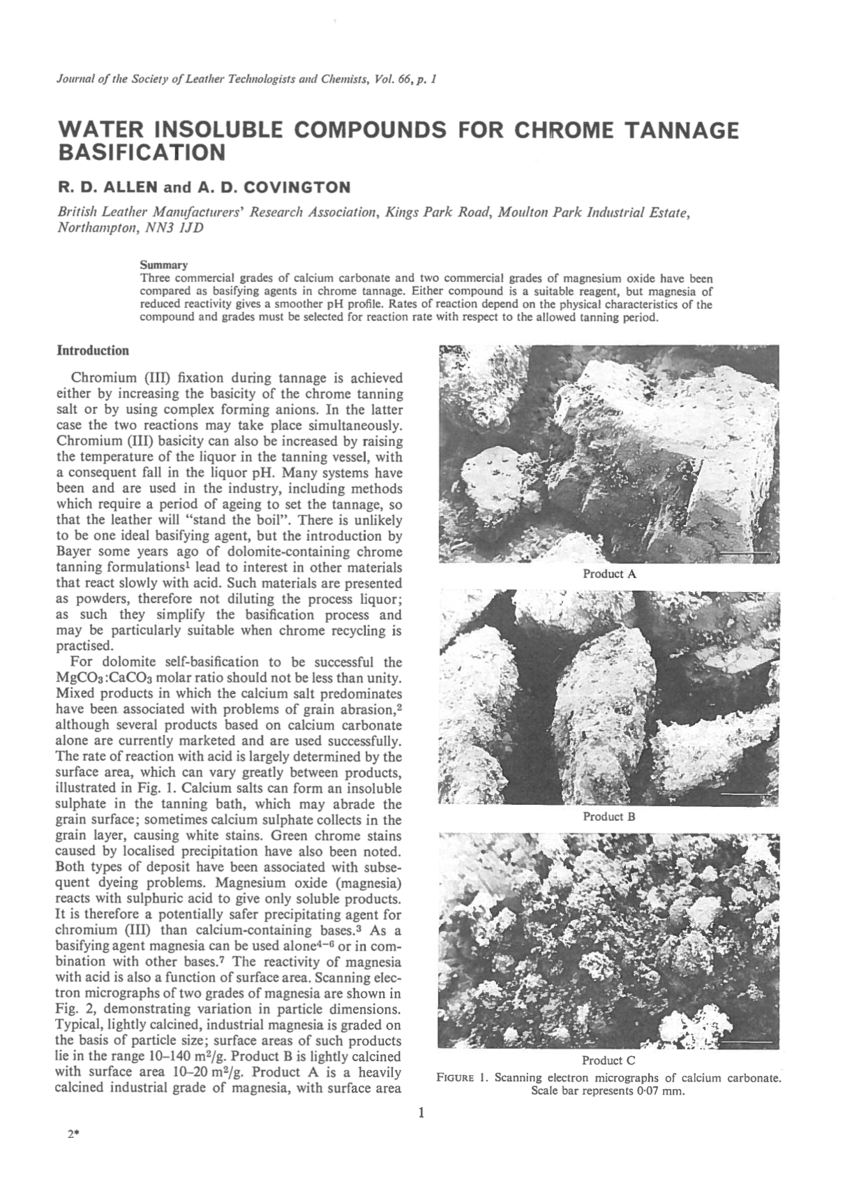 Three commercial grades of calcium carbonate and two commercial grades of magnesium oxide have been compared as basifying agents in chrome tannage. Either compound is a suitable reagent, but magnesia of reduced reactivity gives a smoother pH profile. Rates of reaction depend on the physical characteristics of the compound and grades must be selected for reaction rate with respect to the allowed tanning period.