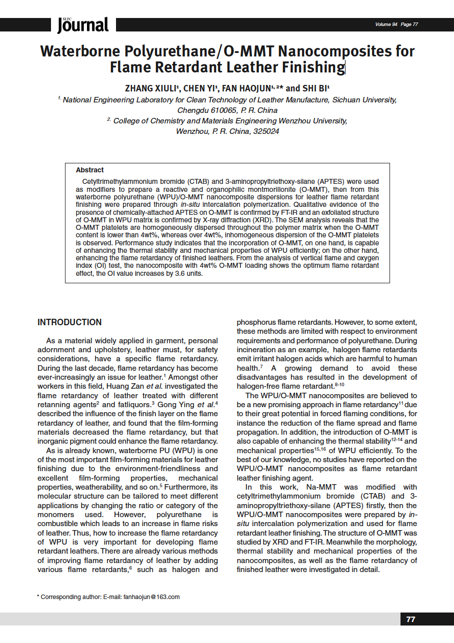 Cetyltrimethylammonium bromide (CTAB) and 3-aminopropyltriethoxy-silane (APTES) were used as modifiers to prepare a reactive and organophilic montmorillonite (O-MMT), then from this waterborne polyurethane (WPU)/O-MMT nanocomposite dispersions for leather flame retardant finishing were prepared through in-situ intercalation polymerization. Qualitative evidence of the presence of chemically-attached APTES on O-MMT is confirmed by FT-IR and an exfoliated structure of O-MMT in WPU matrix is confirmed by X-ray diffraction (XRD). The SEM analysis reveals that the O-MMT platelets are homogeneously dispersed throughout the polymer matrix when the O-MMT content is lower than 4wt%, whereas over 4wt%, inhomogeneous dispersion of the O-MMT platelets is observed. Performance study indicates that the incorporation of O-MMT, on one hand, is capable of enhancing the thermal stability and mechanical properties of WPU efficiently; on the other hand, enhancing the flame retardancy of finished leathers. From the analysis of vertical flame and oxygen index (OI) test, the nanocomposite with 4wt% O-MMT loading shows the optimum flame retardant effect, the OI value increases by 3.6 units.
