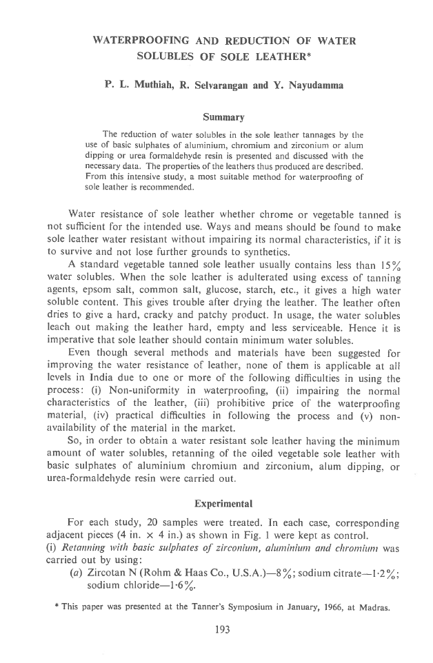 The reduction of water solubles in the sole leather tannages by the use of basic suiphates of aluminium, chromium and zirconium or alum dipping or urea formaldehyde resin is presented and discussed with the necessary data. The properties of the leathers thus produced are described. From this intensive study, a most suitable method for waterproofing of sole leather is recommended.