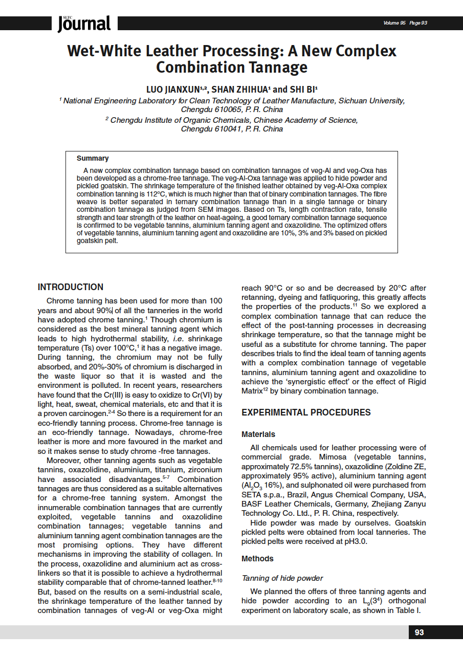 A new complex combination tannage based on combination tannages of veg-Al and veg-Oxa has been developed as a chrome-free tannage. The veg-Al-Oxa tannage was applied to hide powder and pickled goatskin. The shrinkage temperature of the finished leather obtained by veg-Al-Oxa complex combination tanning is 112°C, which is much higher than that of binary combination tannages. The fibre weave is better separated in ternary combination tannage than in a single tannage or binary combination tannage as judged from SEM images. Based on Ts, length contraction rate, tensile strength and tear strength of the leather on heat-ageing, a good ternary combination tannage sequence is confirmed to be vegetable tannins, aluminium tanning agent and oxazolidine. The optimized offers of vegetable tannins, aluminium tanning agent and oxazolidine are 10%, 3% and 3% based on pickled goatskin pelt.